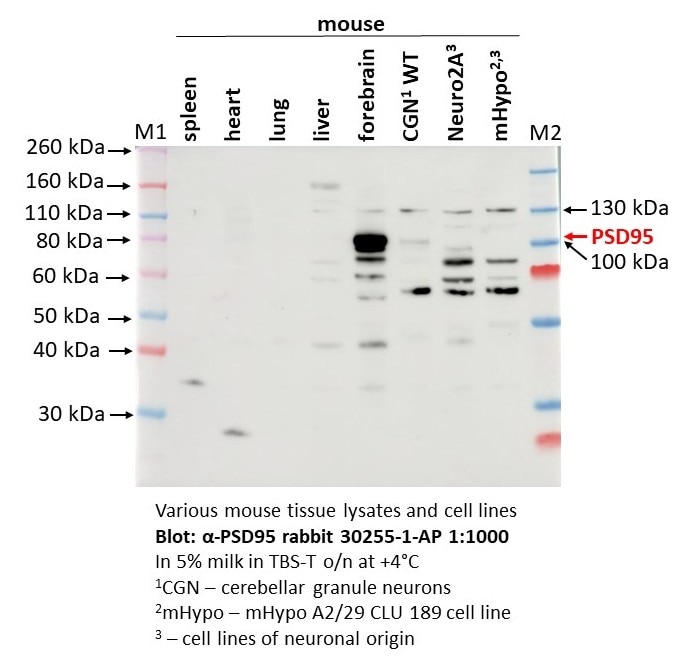 FH Olga (Verified Customer) (10-03-2025) | You can surely dilute it more than 1:1000, as the signal was already saturated at 2.5 seconds of exposition. I find it better for mouse samples as it does not give non-specificity in non-brain tissues (comparing to 20665-1-AP PSD95 antibody) - all the mouse cells tested are of neuronal origin. The principal band size depends on protein marker used (see picture) - and can vary from 80 to 110 kDa.