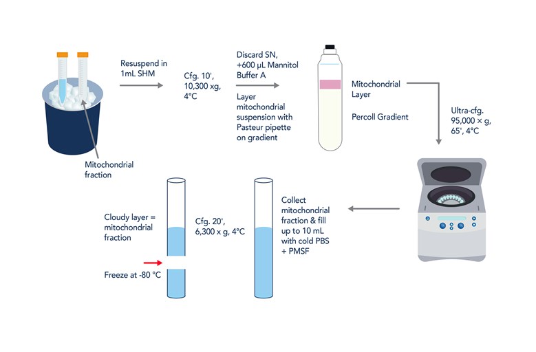 Following collection, the mitochondrial pellet is washed in sucrose homogenization buffer and resuspended in Mannitol Buffer A before being layered onto a Percoll gradient. Ultracentrifugation and subsequent wash steps yield a purified mitochondrial fraction suitable for downstream applications, as shown in Figure 3.