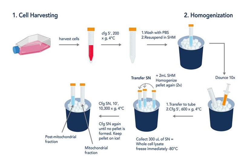 The initial step in subcellular fractionation involves isolating the mitochondrial and post-mitochondrial fractions. This requires cell harvesting, homogenization, and sequential centrifugation, as illustrated in Figure 1.