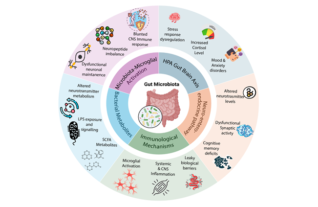 Studies have shown the importance of microglia in various psychiatric disorders, with stress resulting in increased microglial activation as reported by an increase in IBA-1 and GFAP in the hippocampus of mice exposed to stressful stimuli (Xu, Lang et al. 2019). In addition to microbial metabolites, the release of neurotransmitters and neuropeptides has been shown to influence microglial activation and function. RNA sequencing analyses of microglia from germ-free mice reveal altered gene expression patterns and abnormal phenotypes, indicating a compromised ability to respond to immune challenges in the CNS (Huang, Wu et al. 2023; Gui, Liu et al. 2025). Such dysfunctional microglial profiles have been consistently observed in animal models of depression (Hao, Ma et al. 2024), suggesting that disrupted regulation of microglial activity by the gut microbiota may play a key role in the development of psychiatric disorders such as depression and schizophrenia.
