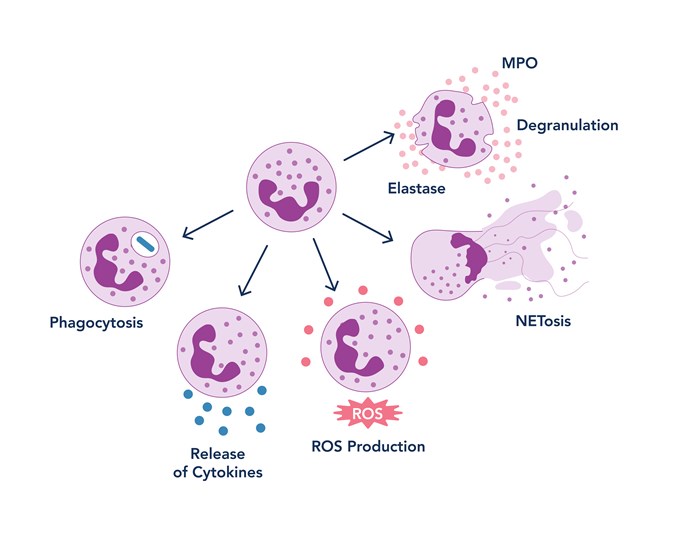 Researchers investigate a wide range of neutrophil functions, including NETosis, reactive oxygen species (ROS) production, chemotactic migration, granule release, and phagocytosis. These functional readouts help us understand how neutrophils contribute to both protective immunity and pathological conditions.