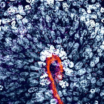 Immunofluorescent staining of the murine small intestine. | Drosophila wild-type ovaries (center) and mutant ovaries with impaired microtubule polymerization (periphery). |