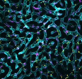 Bhavin Shah: Medizinische Fakultät Mannheim, Universität Heidelberg 4%PFA fixed P21 Mouse Liver Tissue stained for Liver Endothelial cells and other markers. Lyve1 (in Cyan, R&D #AF2125); Stab2 (in Magenta, Peptide speciality Lab #M881-P15) and CD68 (in yellow, Proteintech 25747-1-AP). |