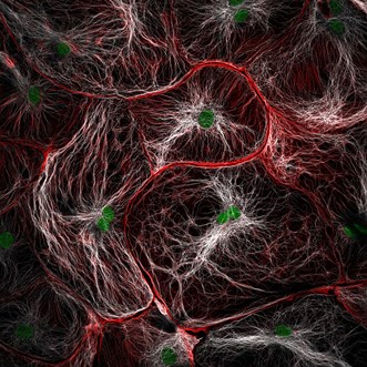Francisco Lázaro-Diéguez: Albert Einstein College of Medicine Dedifferentiated rat liver cells, fixed with 100 % methanol at -20 °C, and stained to visualize microtubules (α-tubulin, white), β-actin (red) (66009-1-Ig), and nuclei (DAPI, green).
