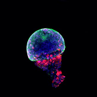 Luisa Barleben: Charité - Universitätsmedizin Berlin A Tale of Two Colonoids: Life and Death in 3D. Side by side, one human colonoid thrives while the other succumbs. The 4% PFA-fixed cells are stained to reveal epithelial barrier (green, CDH1, BD Biosciences, Cat. 610182), proliferation (magenta, Ki67, Invitrogen, Cat. 14-5698-80), apoptosis (red, Cleaved Caspase 3, Cell Signaling, Cat. 9661), and nuclei (DAPI) — capturing a dramatic contrast in a single 3D projection., Colonic organoid grown from murine intestinal epithelial cells fixed in 4% PFA. This flattened Z-projection of the 3D immunofluorescence image shows both Zonula occludens-1 (red, Proteintech, 21773-1-AP) as well as E-cadherin (green, BD Biosciences, 610181) - two pivotal barrier proteins necessary for crypt architecture. Nuclei are counterstained with DAPI in blue. These epithelial colonoids illuminate the spatial relationship between adherens and tight junctions in the 3D tissue. |