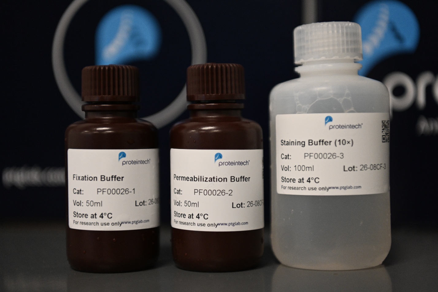 Proteintech's Flow Cytometry Phosphorylated Protein Fixation and Permeabilization Kit (Catalog No. PF00026) is for the detection of phosphorylated proteins by flow cytometry. The kit is suitable for experiments where phosphorylated targets compose a majority of the targets to be detected. This kit includes a fixation buffer, a permeabilization buffer, and a staining buffer.