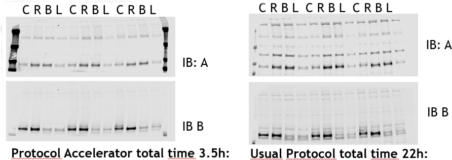 FH Debora (Verified Customer) (02-23-2026) | I tested the Accelerator alongside our usual Western blot protocol using the same cell lysate and antibodies and I absolutely love love LOVE it! While the standard blot was still blocking, I had already finished and imaged the Accelerator blot. It saves a huge amount of time and even showed less background. I incubated at 37°C. Amazing product: faster and cleaner results!