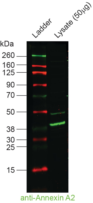Various lysates were subjected to SDS PAGE followed by western blot with 11256-1-AP (Annexin A2 antibody) at dilution of 1:20000 incubated at room temperature for 1.5 hours.