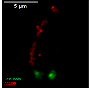 ARL13B, also named as ARL2L1, is a small ciliary G protein of the Ras superfamily. Localized in the cilia, it is required for cilium biogenesis and sonic hedgehog signaling. Defects in ARL13B are the cause of Joubert syndrome (JS) which is an autosomal recessive disorder characterized by a distinctive cerebellar malformation (PMID: 19906870). CoraLite488-Conjugated ARL13B antibody can be used to mark the cilia(green). Ex: 488nm, Em: 515nm
