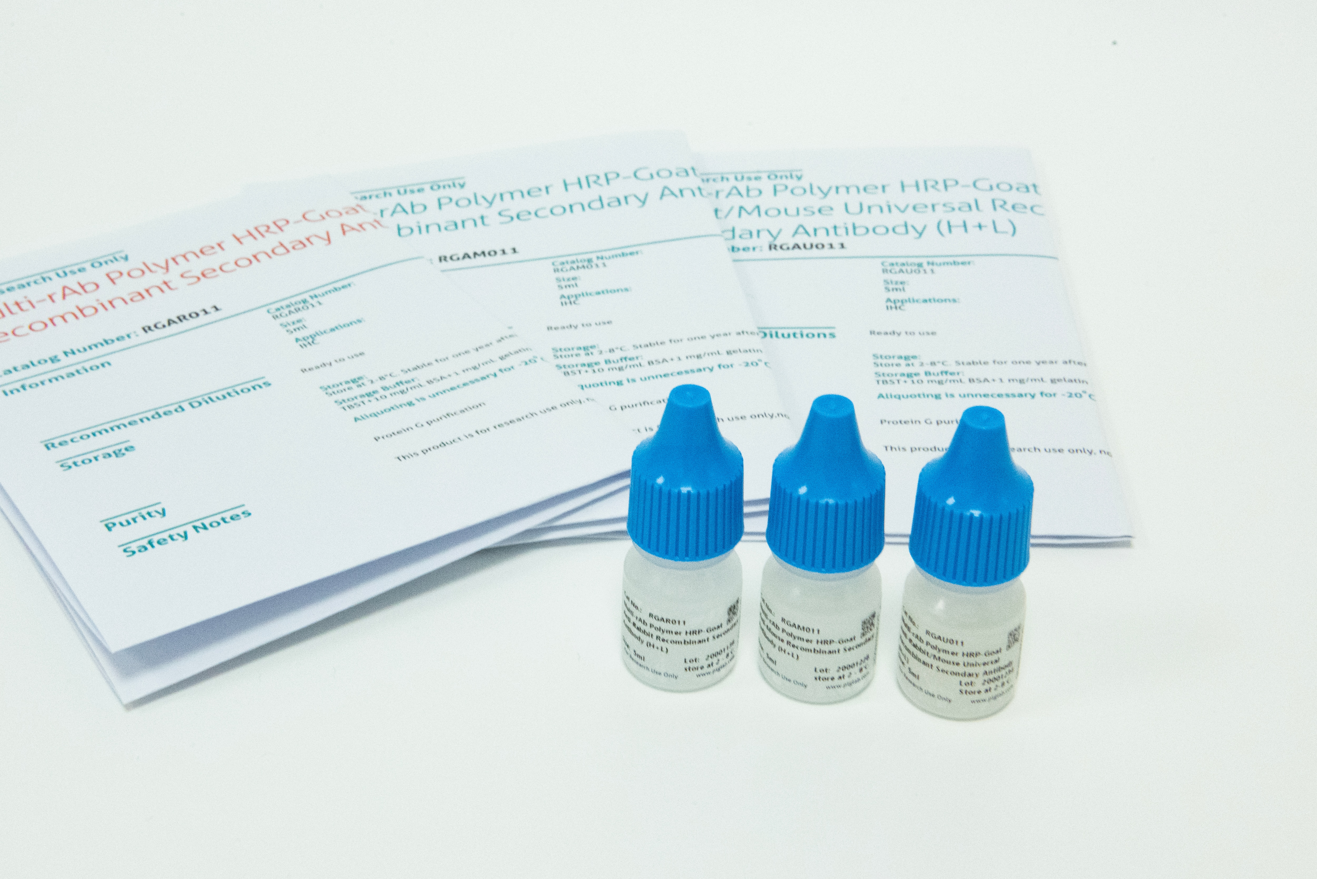 Multi-rAb™ Polymer HRP-Goat Anti-Mouse Recombinant Secondary Antibody (H+L) enables highly sensitive, biotin-free detection of mouse primary antibodies in IHC. Unlike traditional avidin-biotin-based signal amplification methods, polymer HRP-based detection offers the advantages of a lower background and faster protocol with fewer steps. Moreover, Multi-rAb™ Polymer HRP secondary antibodies are provided in a ready-to-use format, in easy-to-use dropper bottles making it extremely convenient for users to incorporate them into their IHC staining protocols.