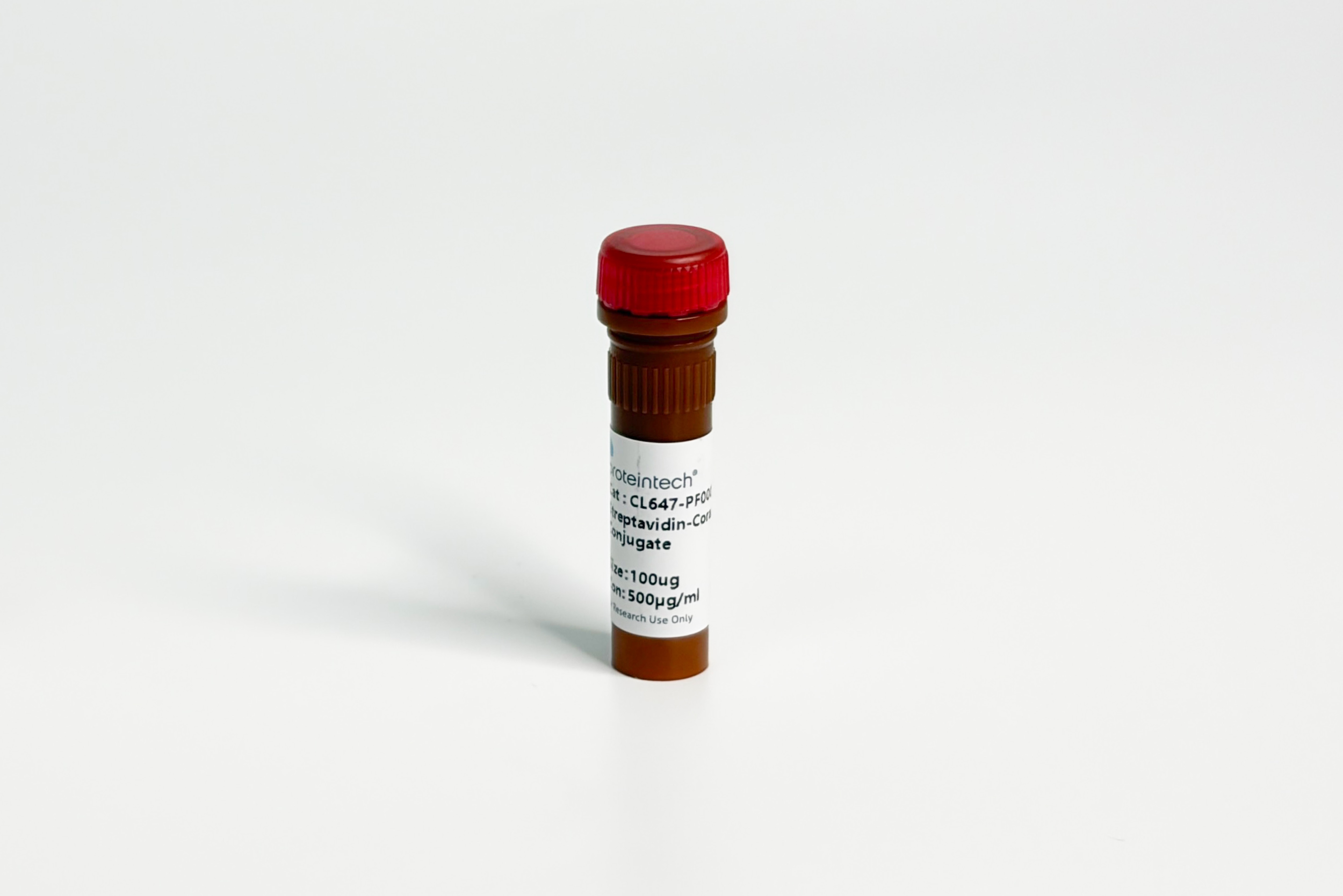 Streptavidin-CoraLite® Plus 647 Conjugate (CL647-PF00030) is a conjugate solution product of a fluorescent marker (CoraLite® Plus 647) and streptavidin. Suggested working solution concentrations or dilutions range from 1:200 to 1:1000. It can be used in conjunction with biotinylated proteins (Biotin-conjugated affinity-purified secondary antibodies of various types, or Biotin-conjugated antibodies and chromatography-grade proteins) for a variety of immunoassays.