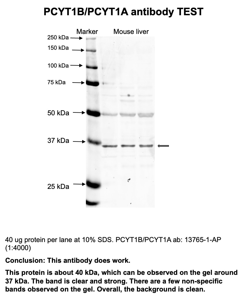 PCYT1B (Phosphate Cytidylyltransferase 1B, Choline), also named as CTβ, CCTB and CCT-Beta, is encoded by the gene belongs to the cytidylyltransferase family. It is involved in the regulation of phosphatidylcholine biosynthesis. Several alternatively spliced transcript variants encoding different isoforms have been found for this gene. PCYT1B encodes three isoforms of CTβ (CTβ1, CTβ2 and CTβ3). CTβ1, CTβ2 isoforms are present in humans and CTβ2 and CTβ3 isoforms have been identified in mice. The CTβ2 can be detected as 41 kDa, and CTβ3 can be detected as 39 kDa. This antibody can recognizes both PCYT1A and PCYT1B. PCYT1A usually exists in the form of a 80 kDa dimer.