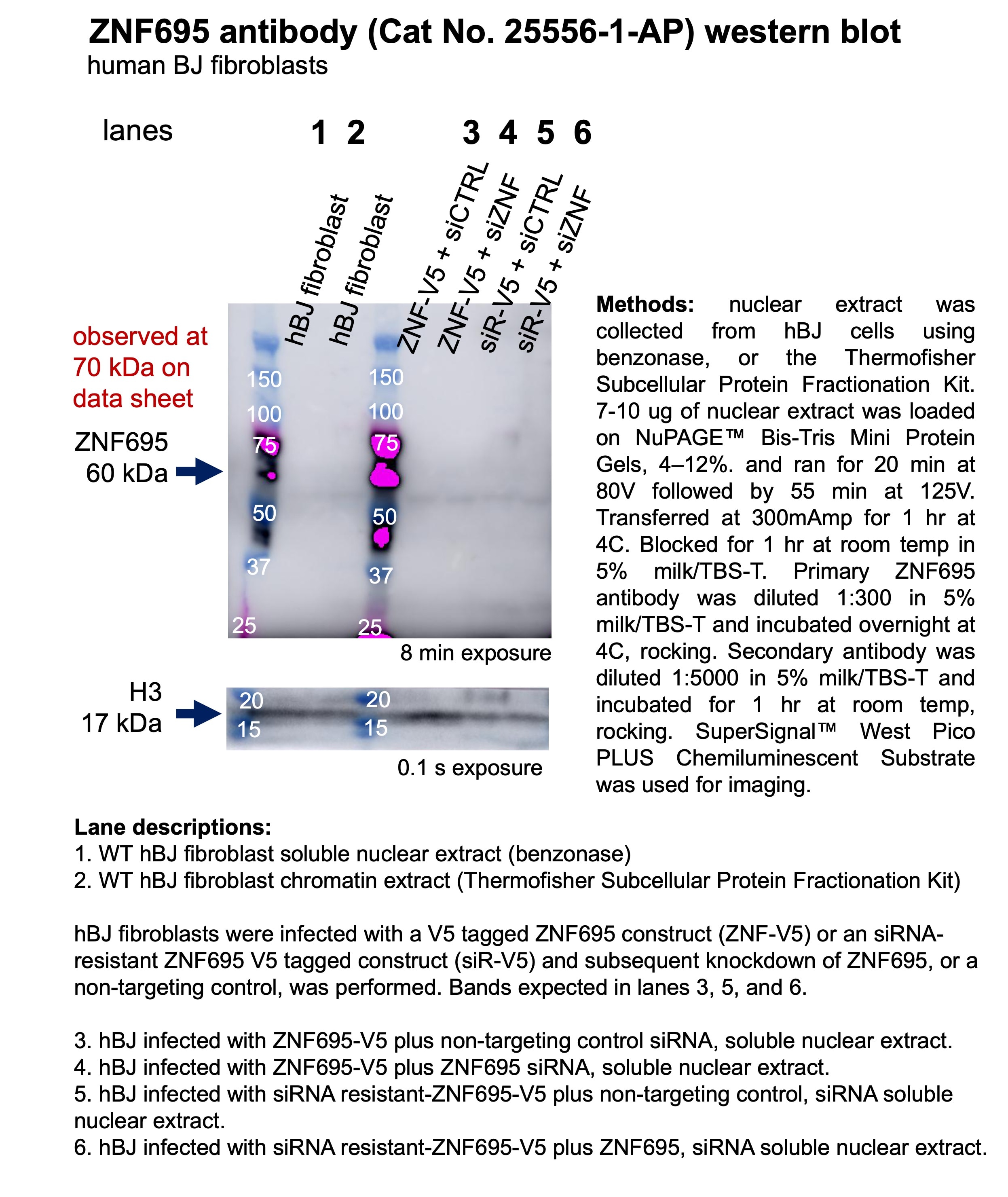 FH Claire (Verified Customer) (01-13-2026) | This antibody did not detect ZNF695 by western blot in three different cell types - hBJ fibroblasts, MCF7, and HEPG2. Please see attached files for details.