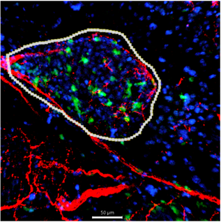 Pancreatic tissue section showing an islet (outlined in white) with resident macrophages (green) distributed both inside and around the islet. Nerve fibers (red), stained using the FlexAble 2.0 conjugation system, are seen in close association with the islet and surrounding exocrine tissue. Nuclei are counterstained in blue. This image highlights the structural proximity of macrophages and nerves to the endocrine islet environment. Green: Macrophages (GFP) Red: Nerves stained with anti-SLC6A2 (norepinephrine transporter) antibody conjugated with CoraLite® Plus 647 Antibody Labeling Kit (Cat. Nr.: KFA503) Blue: Nuclei (Hoechst) Encircled: Islet |