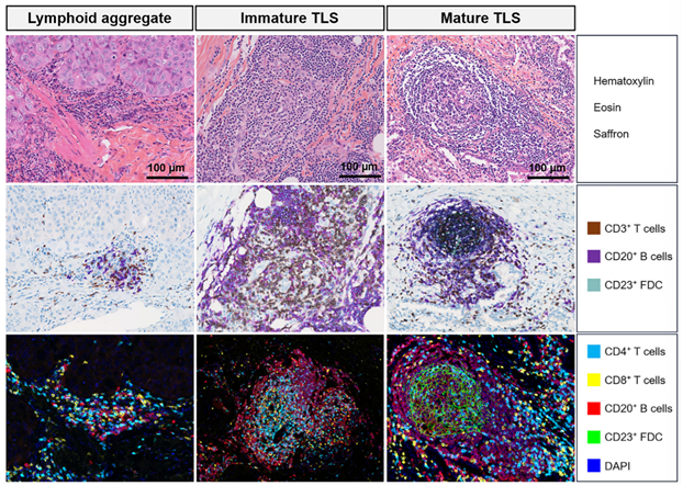 Figure 2. Representative images of different approaches used to identify and quantify TLS in tumors at different maturation stages, including H&E stain (upper row), immunohistochemistry (middle row), and multiplex immunofluorescence (bottom row). Image courtesy of Peyraud et al. (2025)2.