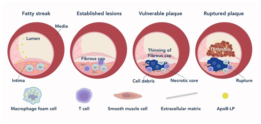Cardiovascular disease is the leading cause of death today and a major driver of global healthcare costs1. The biggest culprit behind these trends is atherosclerosis – a cardiovascular disease characterized by the emergence of atherosclerotic plaques2,3. These lesions are a buildup of lipids, extracellular matrix, cells, and calcifications that form underneath the endothelial layer of larger and mid-sized arteries5. Over several decades, the plaque slowly grows and develops, and in some patients, it eventually ruptures. In these cases, the plaque material encountering blood in the vessel triggers a blood clot formation. If this clot then travels to the brain, it can halt blood flow and cause a stroke, and if it reaches a vessel in the heart, a heart attack may ensue due to arterial blockage6.