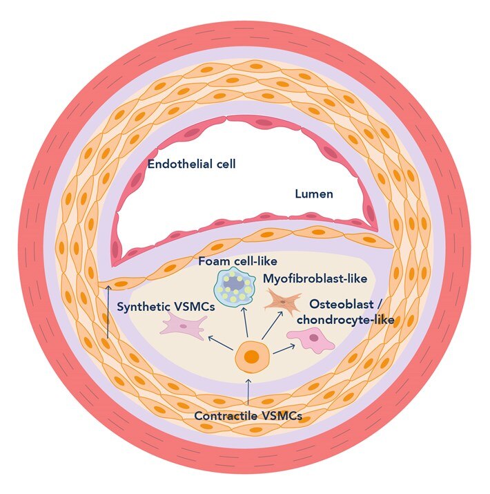 Grootaert, MOJ, Bennett, MR. "Vascular smooth muscle cells in atherosclerosis: time for a re-assessment." Cardiovascular Research. 2021;117:2326-2339. doi: 10.1093/cvr/cvab046
