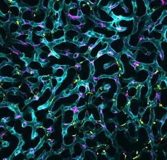 Bhavin Shah: Medizinische Fakultät Mannheim, Universität Heidelberg 4%PFA fixed P21 Mouse Liver Tissue stained for Liver Endothelial cells and other markers. Lyve1 (in Cyan, R&D #AF2125); Stab2 (in Magenta, Peptide speciality Lab #M881-P15) and CD68 (in yellow, Proteintech 25747-1-AP). |