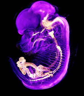 Lobke Mombeek: Hasselt University An E16 mouse embryo (4% PFA fixed) was processed using the iDISCO+ tissue clearing protocol. Immunolabeling was carried out with antibodies against Phox2B - orange (AF4940) to identify enteric neural precursors and Tubb3 - purple (PRB-435P) to visualize neuronal fibers. Three-dimensional imaging was performed on a Zeiss Lightsheet 7 microscope equipped with an EC Plan-NEOFLUAR 5x/0.16 objective. Imaging was conducted by Dr. Margarita Tevosian.