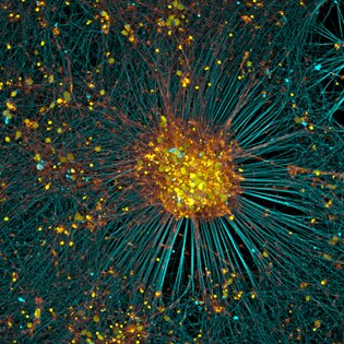 Bruno Cisterna: Augusta University Immunofluorescence micrograph of neurons differentiated from induced pluripotent stem cells (iPSCs) after 62 days of maturation. Cells fixed with 3% paraformaldehyde and 0.1% glutaraldehyde. The actin cytoskeleton is orange, microtubules in cyan, and nuclei in yellow. Imaging using a Nikon CSU-W1 SoRa spinning disk confocal microscope equipped with a Hamamatsu ORCA-Fusion BT camera and a 40x objective lens., Super-resolution spinning disk confocal image of a cath.a-differentiated (CAD) cell in late stage of differentiation stained for F-actin – white (cat no: A22287. ), microtubules – green (cat no: ab4074.). The cells were fixed and permeabilized with 3% paraformaldehyde, 0.1% glutaraldehyde, 4% sucrose, 0.5% Triton X-100. Objective Lens Magnification: 100x., Super-resolution spinning disk confocal image of a cath.a-differentiated (CAD) cell stained for F-actin – yellow (cat no: A22287.), microtubules – cyan (cat no: ab7291. ), and mitochondria – magenta (cat no: 11802-1-AP. Proteintech). The cell was fixed and permeabilized with 3% paraformaldehyde, 0.1% glutaraldehyde, 4% sucrose, 0.5% Triton X-100. Objective Lens Magnification: 100x. |