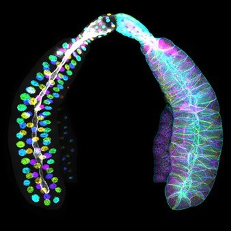 Immunofluorescent staining of the murine small intestine. | Drosophila wild-type ovaries (center) and mutant ovaries with impaired microtubule polymerization (periphery). |