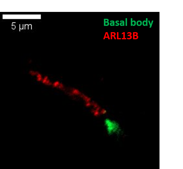 FH Serhiy (Verified Customer) (12-21-2022) | Excellent for immunofluorescent staining of ciliary Arl13b in mouse cells. Image shows ciliary axonemes immunostained for Arl13b (red).