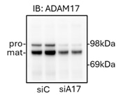 FH franck (Verified Customer) (01-23-2026) | Cells were lyzed with RIPA buffer with protease inhibitor cocktail and ADAM17 inhibitor. NuPAGE 4-12% gel, MES migration. pro: proform of ADAM17 mat: mature form of ADAM17 siC: control siRNA SiA17: si RNA specific for ADAM17