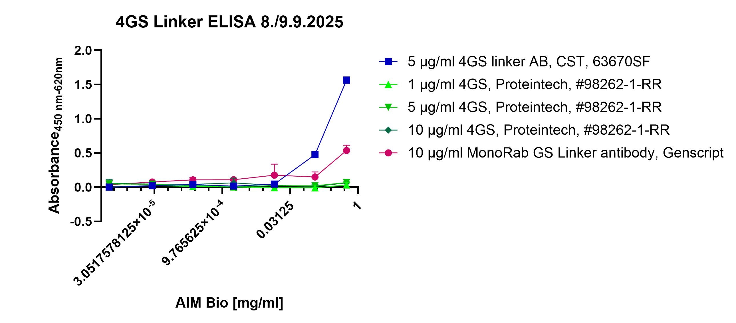 FH Daniela (Verified Customer) (10-27-2025) | The antibody was used as coating antibody for an ELISA setup (tested 1 µg/ml, 10 µg/ml)d: 1 µg/ml, 5 µ to quantify a protein containing a (GGGGS)4 motif (0.5 µg/ml followed by detection using a b2m-biotin antibody) which was not working at all. According to the tech support, detection of a (GGGGS)4 motif is not working, but it would be working good for a (GGGGS)3 motif which could not be tested due to lack of material. A 4GS antibody from CST and from Genscript were used as positive controls that were both working.