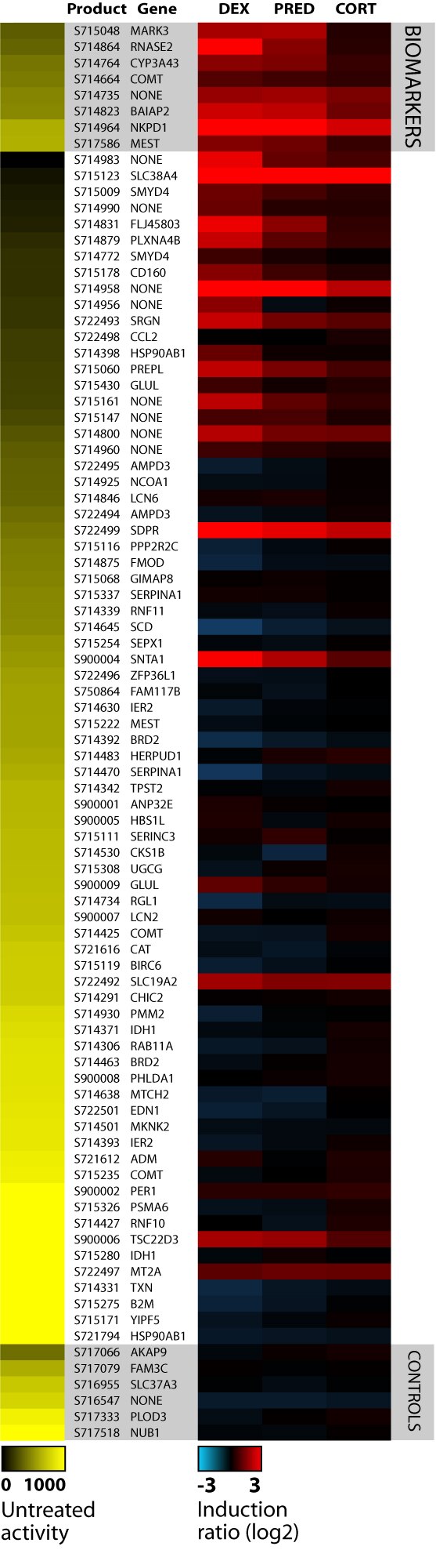 The heatmap at right shows the untreated and induced activity for all constructs that are members of the pathway profiling plate. On the right side of the figure, the colors represent log2 transformed ratios of treated/untreated activity according to the color scale shown at the base of the heatmap. Black indicates no change; the intensity of red or blue color indicates levels of induction or repression, respectively. On the left side of the figure, the intensity of yellow color depicts the activity of each promoter in the unstimulated (untreated) condition. All untreated signals are relative to the highest and lowest values within the individual experiment. (“DEX” = HT1080 fibrosarcoma cells treated with 100 nM dexamethasone for 4 hours; “PRED” = HT1080 fibrosarcoma cells treated with 1 µM prednisone for 4 hours ; “CORT” = HT1080 fibrosarcoma cells treated with 1 µM cortisone for 4 hours.)