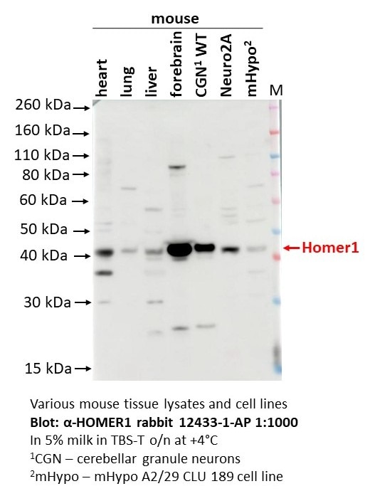 12433-1-AP targets HOMER1 in WB, IHC, IF/ICC, IF-P, FC (Intra), IP, ELISA applications and shows reactivity with human, mouse, rat samples.