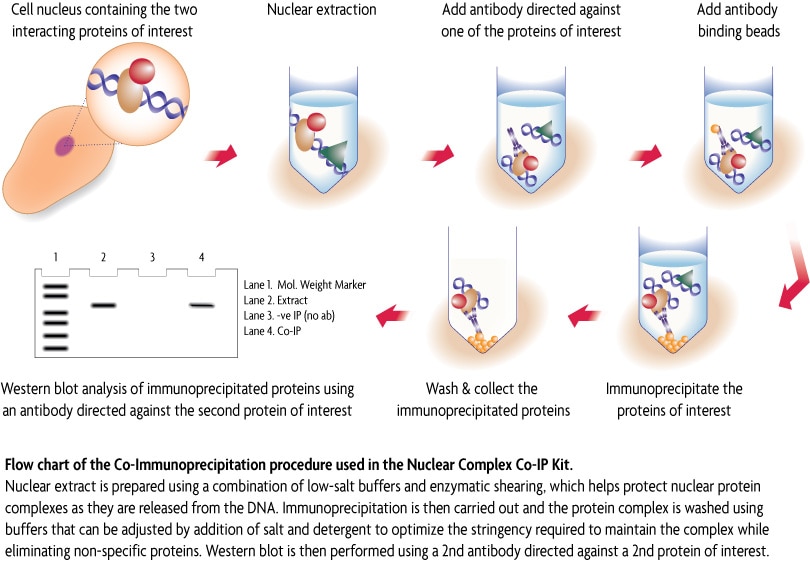 For a complete list of reagents included in the Nuclear Complex Co-IP kit, please select the Contents tab below. For optimization of your Co-IP conditions, additional 5X IP High Buffer, 5X IP Low Buffer and Detergent may be purchased separately.