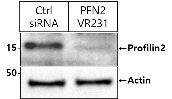 PFN2 (profilin 2) is a ubiquitous actin monomer-binding protein belonging to the profilin family. It is thought to regulate actin polymerization in response to extracellular signals. The MW of this protein is 15 kDa, and this antibody specially recognises the 15 kDa protein.