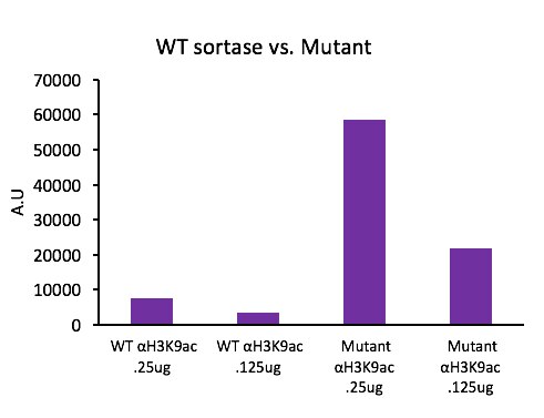 Sortase A5 recognizes an antibody or protein genetically engineered to contain the LPXTG motif (where X is any amino acid). Sortase A5 cleaves this sequence between the threonine and glycine residues and the terminal glycine is then replaced with any poly-Glycine (G)n label. Sortase A5 is used in Active Motif’s Sortag-IT Labeling Kits to attach HRP, biotin, fluorophores and other labels directly to Active Motif’s AbFlex recombinant antibodies (rAb). The activity of both wild type and Sortase A5 pentamutant proteins are Ca2+ dependent, therefore, Active Motif’s Sortag-IT labeling buffers and reagents are formulated to contain Ca2+ for optimal protein labeling. In addition, our AbFlex recombinant antibodies are provided in HEPES buffer, which is does not bind Ca2+ and will not interfere with the Sortase A5 enzymatic activity.