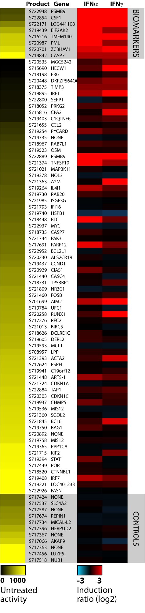 The heatmap at right shows the untreated and induced activity for all constructs that are members of the pathway profiling plate. On the right side of the figure, the colors represent log2 transformed ratios of treated/untreated activity according to the color scale shown at the base of the heatmap. Black indicates no change; the intensity of red or blue color indicates levels of induction or repression, respectively. On the left side of the figure, the intensity of yellow color depicts the activity of each promoter in the unstimulated (untreated) condition. All untreated signals are relative to the highest and lowest values within the individual experiment. (“IFNα” = HeLa human cervical cancer cells treated with 500 U/ml interferon alpha for 8 hours; “IFNγ” = HeLa human cervical cancer cells treated with 100 ng/ml interferon gamma for 8 hours.)